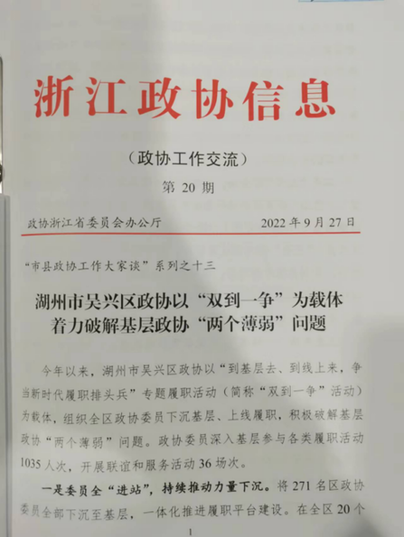 今年以来,吴兴区政协深入贯彻落实习近平总书记关于加强和改进人民政协工作的重要思想,积极破解基层政协“两个薄弱”问题,以“到基层去、到线上来,争当新时代履职排头兵”专题履职活动(下称“双到一争”活动)为载体,组织动员全区政协委员下沉基层、上线履职,以实际行动践行为民履职宗旨,以创新举措推动政协履职数字化变革步伐,不断促进政协履职提质增效。相关做法在省政协《浙江政协信息》(政协工作交流)上刊发,并被《人民政协报》、学习强国、《联谊报》、浙江政协同心苑等媒体宣传报道。